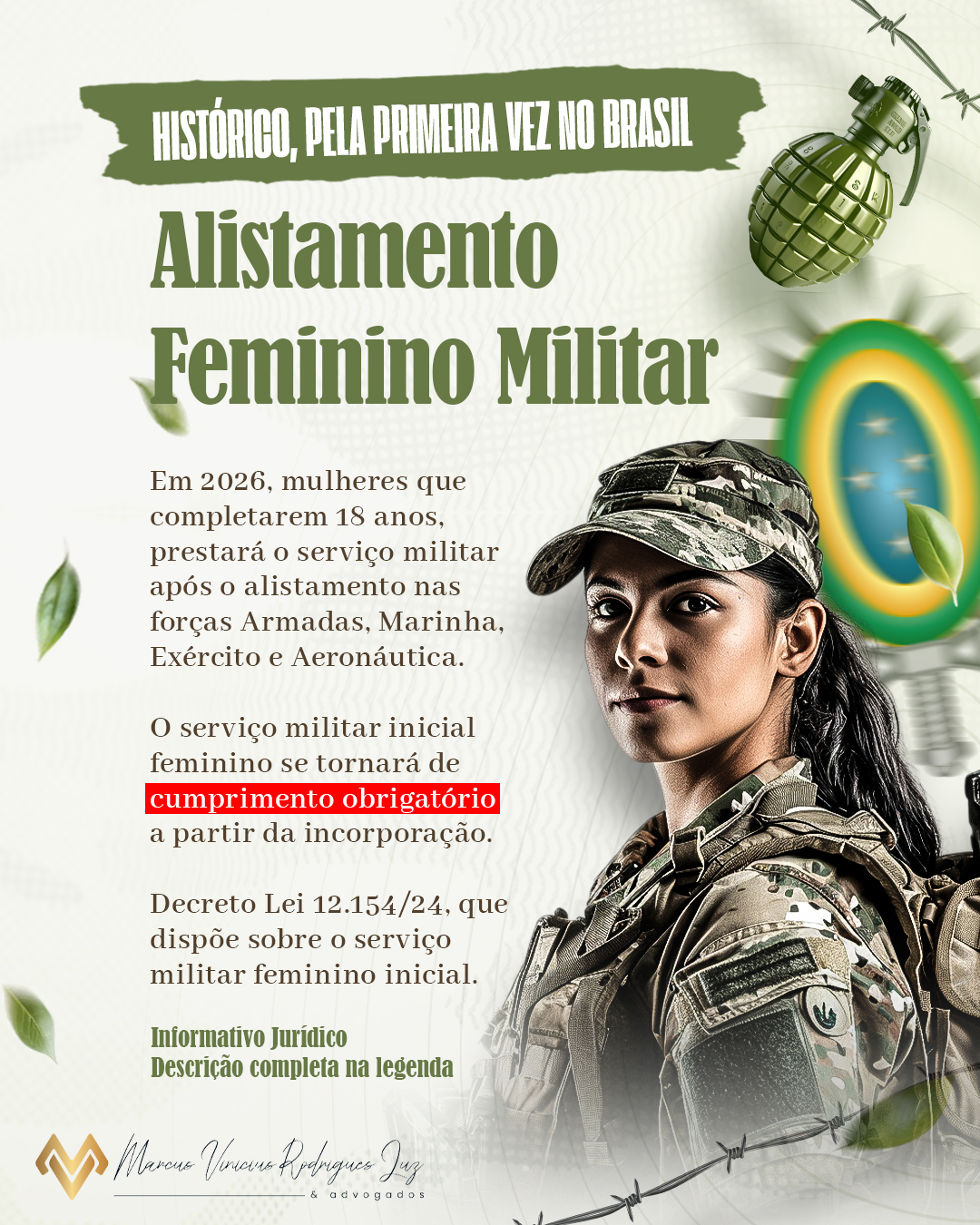 🔰🪖 No Brasil pela primeira vez, foi legislado por decreto da presidência da república o alistamento, seleção e incorporação feminina militar. Mulheres que completarem dezoito anos, prestará o serviço militar após o alistamento nas forças Armadas, Marinha, Exército e Aeronáutica, conforme Decreto 12.154/24, que dispõe sobre o serviço militar feminino inicial. A partir do ato oficial de incorporação, o serviço militar inicial feminino se tornará de cumprimento obrigatório, e a militar ficará sujeita aos direitos, aos deveres e às penalidades, nos termos do disposto na Lei nº 4.375, de 17 de agosto de 1964, e no Decreto nº 57.654, de 20 de janeiro de 1966. Fará jus ao Certificado de Reservista a militar que concluir a instrução militar suficiente para o exercício de funções gerais básicas, bem como o engajamento, cursos e promoções. 🔰🪖